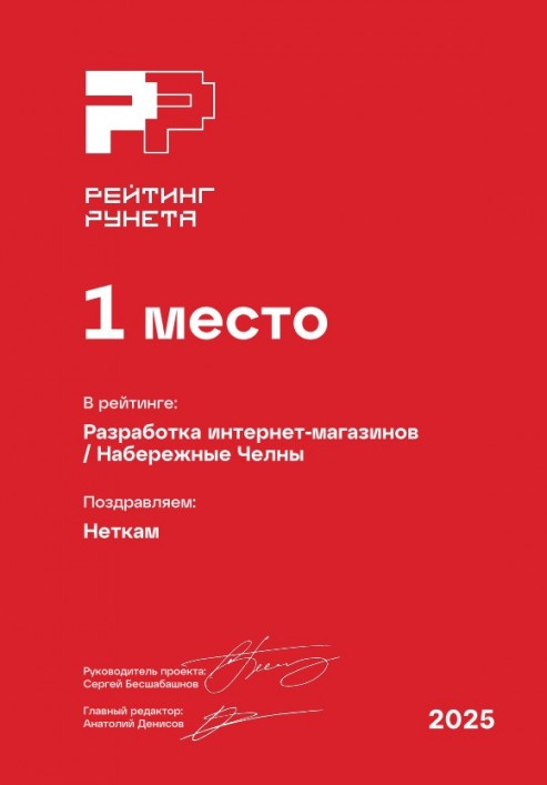 1 место в рейтинге веб-студий Набережных Челнов, занимающихся разработкой интернет-магазинов. Премия Рейтинг Рунета — 2025.