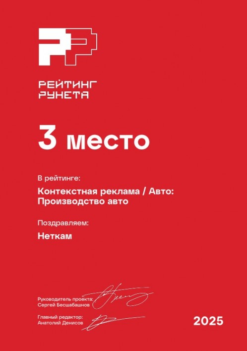 3 место в рейтинге агентств контекстной рекламы, сфера «Авто». Премия Рейтинг Рунета — 2025.