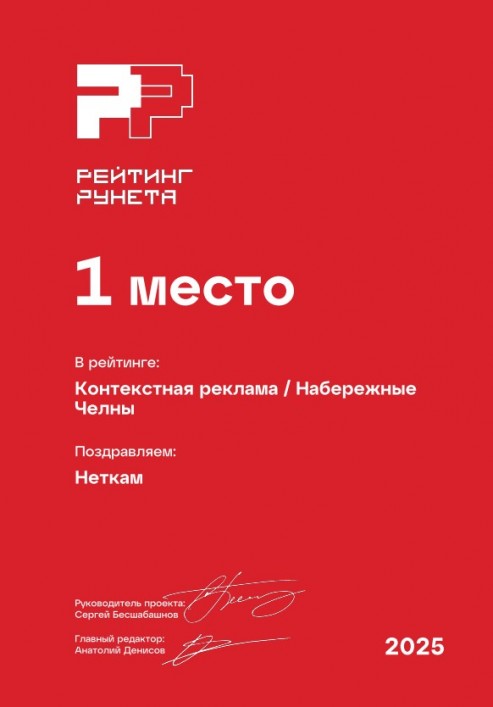 1 место в рейтинге в рейтинге агентств контекстной рекламы Набережных Челнов. Премия Рейтинг Рунета — 2025.