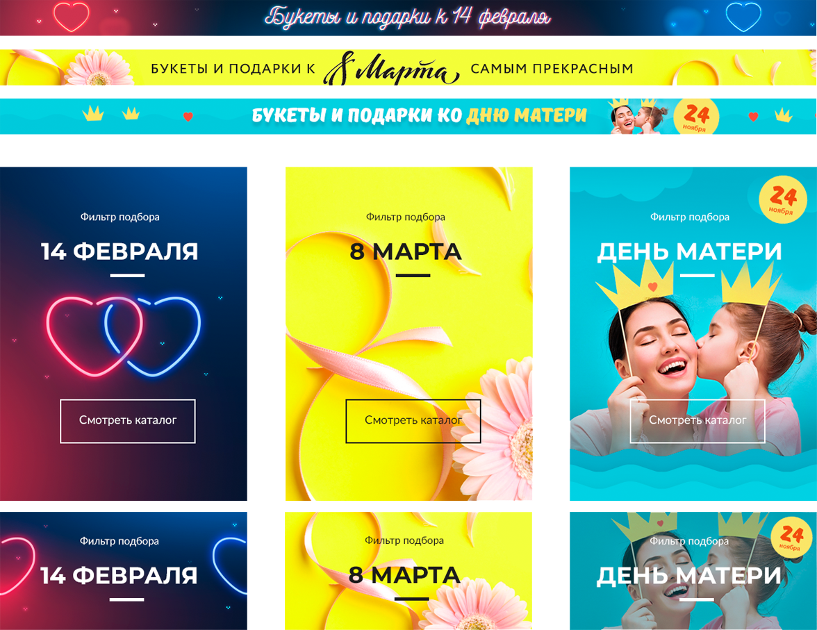 Акционные тематические праздничные банеры на сайт доставки цветов и подарков